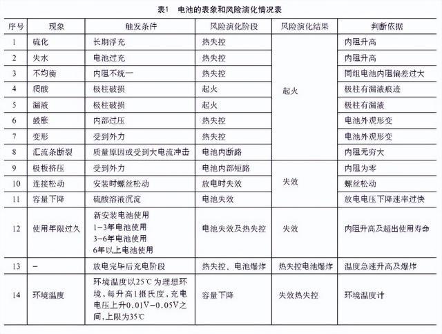 2)电池的更换标准:通过查阅大量资料文献及标准,包括国家标准(GB)、电力行业标准(DL)、通讯行业标准(YD)等标准,以及注明电池检测仪表厂家(福禄克、日置)等,其中各种标准说法不一,其原因主要是因为市面上生产电池厂商品牌不一,难以进行统一,其中具有代表性的以电池容量为指标,日置仪表检测厂商以内阻检测值的1.5倍为指标,而在实际的生产运行过程当中,蓄电池的负荷能力只是蓄电池检测过程当中一项指标,其中尤为重要的安全风险问题在各类标准中又未曾提及,而安全风险问题对于航站区内等地点又是坚决不能接受的。