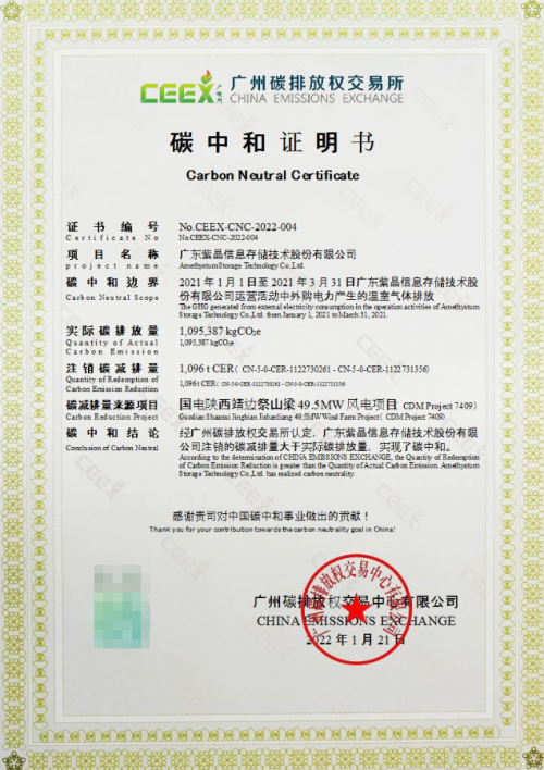 光存储正在推动整个数据中心迈向绿色节能,广州碳排放权交易所向紫晶存储颁发了碳中和证明。