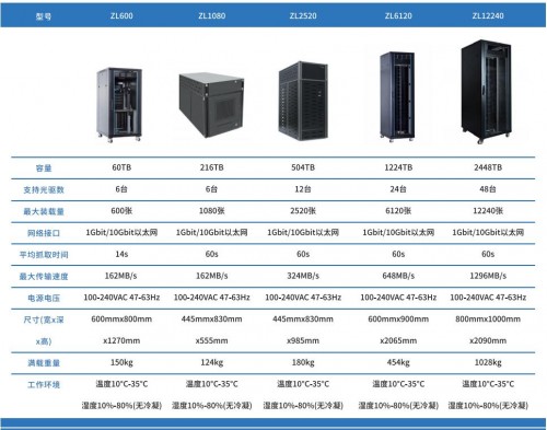 紫晶ZL系列支持从60TB到2448TB容量,同时传输速率最高可达1296MB/s,光盘加载数量最高12240片,采用整机柜式设计,网络方面支持1Gb/10Gb Ethernet接口。