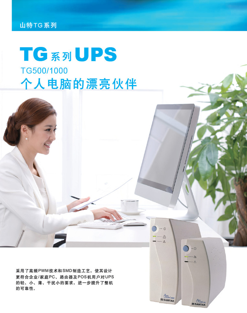 山特TwinGuard(TG)系列UPS适用于PC机及其外围设备( 打印机、扫描仪、路由器 、Modem),稳定性高,可靠性强。轻松走入家庭和办公环境,帮您节省有效空间。对于PC用户而言,计算机周围拥挤不堪的状况变得轻松、和谐。面板简洁明快、容易操作。