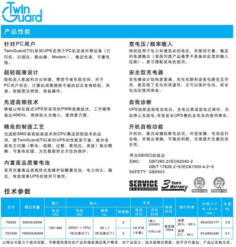 先进的SMD表面贴装技术和 CPU集成控制技术的应用,使TwinGuard(TG)系列UPS 的性能更可靠。能对各类电力问题 ( 断电、短路 、过载 、高低压、突波) 做出准确、可靠地处理,为负载提供保护。