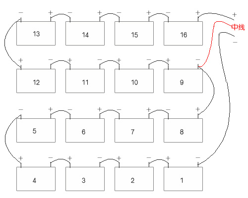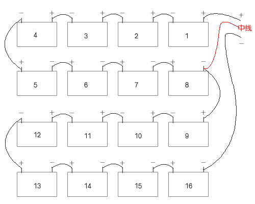 当没有万能表的时候,只能通过人工排查的方法确认中线是否正确。下面以16只电池为例。从出来的正极线开始,按顺序查看中线是从第几块电池的正极或负极接出来的。如果是第8块电池的负极或者第9块电池的正极接出来的,说明中线接的正确。如下图